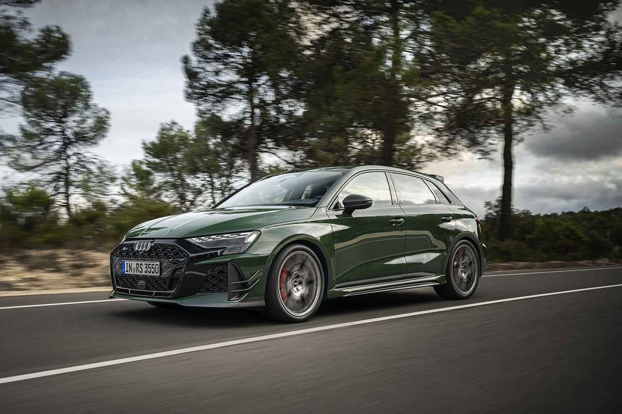 パワートレインには、現行Audi RS 3と同じ2.5L直列5気筒TFSIターボを搭載する。最高出力294kW(400PS)、最大トルク500Nmを発生し、0→100km/h加速は3.8秒、最高速度は290km/hに達する。独特の排気音は点火順序「1-2-4-5-3」によるもので、RSスポーツエグゾーストと可変フラップ制御により、モードによってさらに迫力あるサウンドを楽しめる。