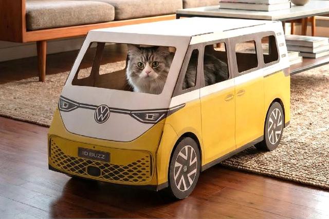 「VWにゃんバサダー」に選ばれた3匹の猫には、就任祝いとして「ID.Buzz 特製ダンボールカー」が贈られる。この賞品はフォルクスワーゲンのアイコン的モデル「ID.Buzz」を模したもので、猫が実際に乗って遊べるサイズで設計されている。愛猫がドライバーになりきった姿をSNSで紹介してほしいとのことだ。